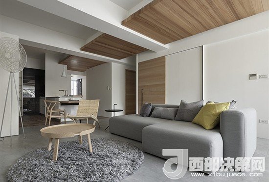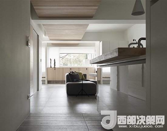 站在長(zhǎng)廊一頭視線忍不住會(huì)跟著木質(zhì)頂板向前眺望,一直延伸至窗外,室外的采光經(jīng)過(guò)漫反射幾乎可以引入整個(gè)客廳。