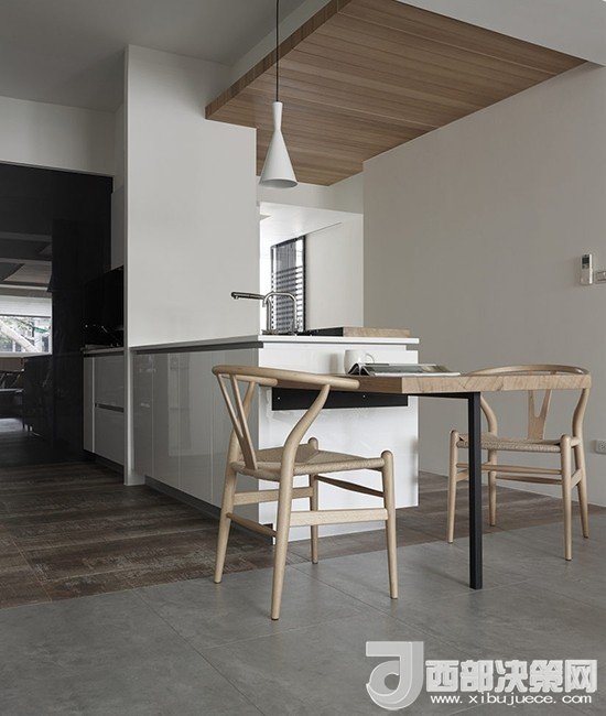 將洗手臺(tái)放在中間的位置,配上組合的簡(jiǎn)易餐桌,不做吧臺(tái)的設(shè)計(jì)也能滿足開(kāi)放式的需求,在家下廚較少的業(yè)主可以考慮。