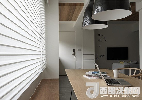 為了符合簡(jiǎn)單純粹的設(shè)計(jì)理念,沒(méi)有電視柜的背景墻上放置了一個(gè)藝術(shù)時(shí)鐘,可移動(dòng)的數(shù)字設(shè)計(jì)展現(xiàn)了一種道家的精神。