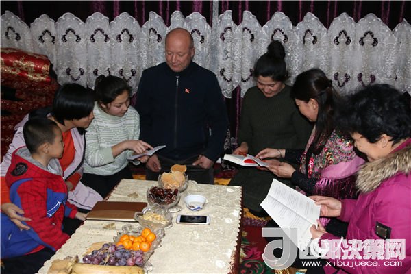 2017年12月30日,新疆吐魯番市托克遜縣第一中學(xué)三名任課教師來到初三學(xué)生蘇爾婭·巴克爾(左三)家中開展“住家式”家訪,同吃同住同學(xué)習(xí),共學(xué)黨的十九大精神。阿爾達克 攝