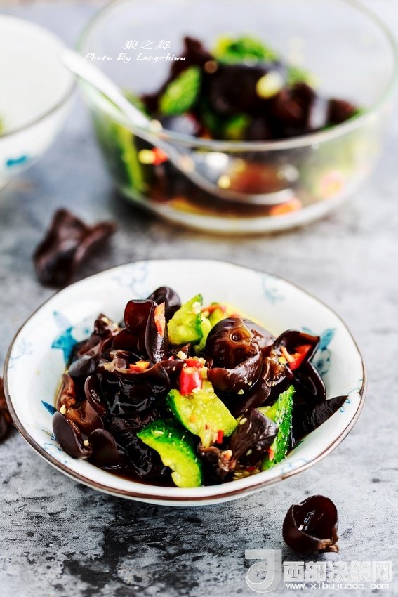 食材:黑木耳適量、精鹽1/4茶匙、黃瓜1根、白糖1/2茶匙、陳醋1茶匙、生抽1.5茶匙、紅辣椒適量。