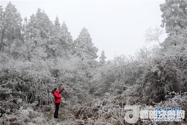 1月7日,一名游客在貴州省黔東南苗嶺國(guó)家地質(zhì)公園拍攝霧凇景觀。寒冬時(shí)節(jié),位于貴州省黔東南州的苗嶺國(guó)家地質(zhì)公園出現(xiàn)云海霧凇景觀,原始森林和草場(chǎng)在云海中若隱若現(xiàn),美若畫卷。(楊文斌攝)