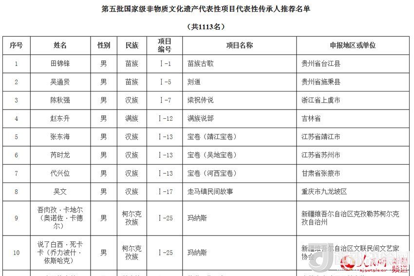 在各地推薦申報(bào)的基礎(chǔ)上,各評審組專家對全國31個(gè)?。▍^(qū)、市)、新疆生產(chǎn)建設(shè)兵團(tuán)、中央有關(guān)部門及港澳地區(qū)推薦的申報(bào)人進(jìn)行了評審,經(jīng)評審委員會(huì)審議,提出了第五批國家級非物質(zhì)文化遺產(chǎn)代表性項(xiàng)目代表性傳承人推薦名單(共1113人)。其中對尚未認(rèn)定過國家級代表性傳承人的項(xiàng)目,本次推薦827人,對已認(rèn)定過國家級代表性傳承人的項(xiàng)目,本次推薦286人。