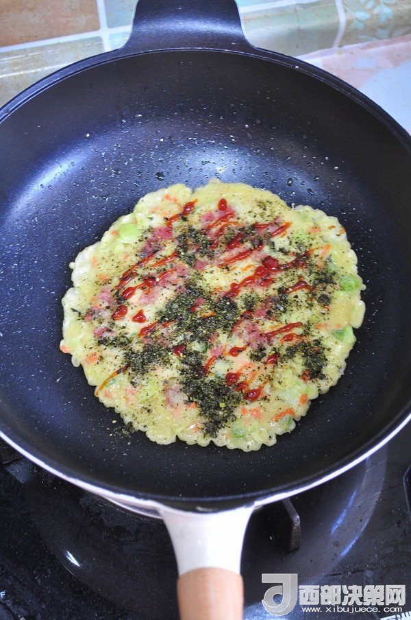 “大阪燒是一種日式蔬菜煎餅,有些地區(qū)根據(jù)日文漢字的寫法,也叫做“御好燒”,為日本關(guān)西的一種民間美食,也是大阪飲食文化的代表。由于外觀的關(guān)系,也有人稱大阪燒為“日本式比薩餅”,可以說放上去的食材,并沒有特殊規(guī)定,一般是自己想吃什么就放什么。吃膩了中式的雞蛋薄餅,換個(gè)口味也別俱一格。做這個(gè)頂重要的是,一定要用不粘鍋,不然想翻面的時(shí)候,底部巴鍋底不動(dòng),而且還容易上面的沒熟,下面的已經(jīng)糊了。”