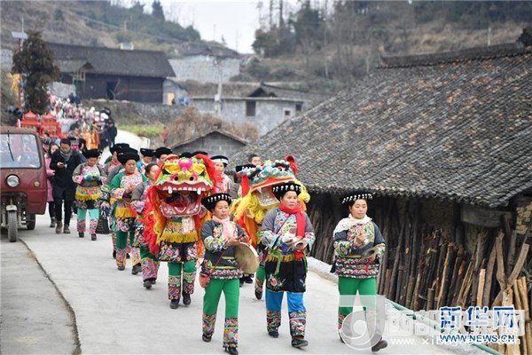 在湖南省湘西土家族苗族自治州花垣縣十八洞村,接親隊(duì)伍在行進(jìn)中(2月4日攝)。