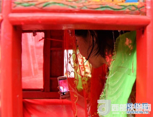 2月4日,在湖南省湘西土家族苗族自治州花垣縣十八洞村,新娘孫貝莎在花轎中自拍。