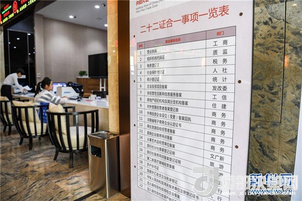河南自貿(mào)區(qū)開封片區(qū)綜合服務(wù)中心內(nèi)的“二十二證合一事項一覽表”(2017年6月16日攝)。新華社記者李博攝