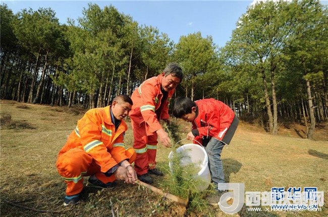 3月10日,沙子坡林場的護(hù)林員與他們的孩子在林區(qū)補(bǔ)植樹苗。
