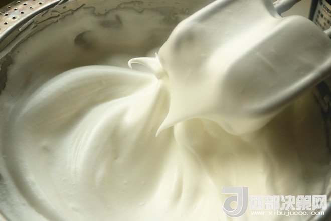 5.蛋白加入幾滴檸檬汁,攪拌至大粗泡時加入三分之一白砂糖,繼續(xù)打發(fā)到蛋白體積膨大到2倍時,再加入三分之一白砂糖。繼續(xù)打發(fā)到剛剛出現(xiàn)彎鉤還很軟的時候,加入最后的三分之一砂糖。再打發(fā)到濕性發(fā)泡,也就是有大彎鉤的狀態(tài)就好,蛋糕卷不需要打發(fā)太干,避免卷的時候開裂。