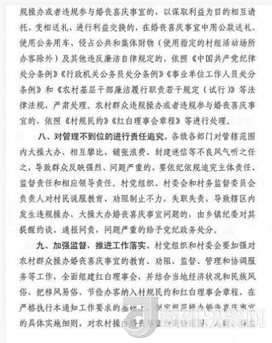 各級各部門對管轄范圍內(nèi)大操大辦、相互攀比、鋪張浪費、封建迷信等不良風氣聽之任之,導(dǎo)致群眾反映強烈、問題嚴重的,要依紀依規(guī)追究主體責任、監(jiān)督責任和相應(yīng)領(lǐng)導(dǎo)責任。村黨組織、村委會和村務(wù)監(jiān)督委員會負責人對村民說服教育、勸阻制止不力,失職失責,導(dǎo)致轄區(qū)內(nèi)發(fā)生違規(guī)操辦、大操大辦婚喪喜慶事宜問題的,由鄉(xiāng)鎮(zhèn)紀委對其提醒約談、通報問責,問題嚴重的給予黨紀政務(wù)處分。