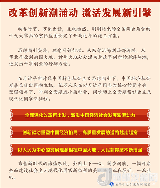 “我們要以更大的力度、更實(shí)的措施全面深化改革、擴(kuò)大對外開放,貫徹新發(fā)展理念,推動(dòng)經(jīng)濟(jì)高質(zhì)量發(fā)展,建設(shè)現(xiàn)代化經(jīng)濟(jì)體系,不斷增強(qiáng)我國經(jīng)濟(jì)實(shí)力、科技實(shí)力、綜合國力,讓社會(huì)主義市場經(jīng)濟(jì)的活力更加充分地展示出來。”習(xí)近平總書記在十三屆全國人大一次會(huì)議上的重要講話,再次發(fā)出了全面深化改革的號(hào)召。