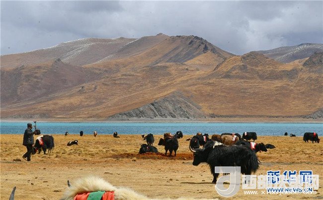 湖畔的牧民和牦牛(4月8日攝)。