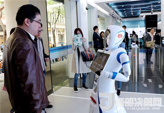 一位市民在位于上海九江路的無人銀行入口處向迎賓機(jī)器人說明需要辦理的業(yè)務(wù)種類(4月12日攝)。近日,中國(guó)建設(shè)銀行在上海九江路開出國(guó)內(nèi)首家無人銀行。新華社記者 方喆 攝
