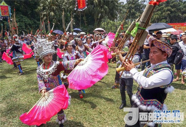 4月18日,在廣西柳州市龍?zhí)豆珗@,人們進行蘆笙踩堂慶祝“三月三”。新華社發(fā)(賴柳生 攝)