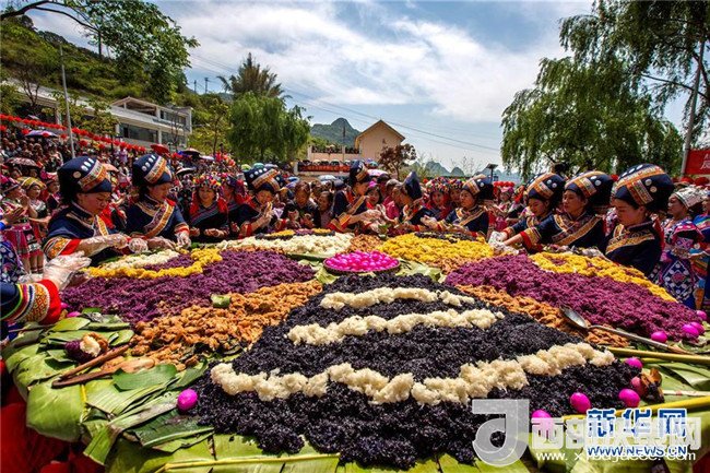 4月18日,在廣西河池市鳳山縣三門海鎮(zhèn)坡心村,人們品嘗五色糯米飯慶祝“三月三”。新華社發(fā)(周恩革 攝)