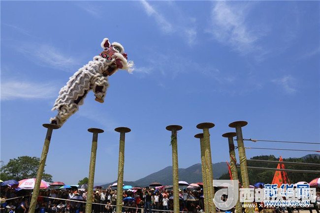 4月18日,在廣西柳州市融水苗族自治縣三防鎮(zhèn),人們觀看高空舞獅表演。新華社發(fā)(龍濤 攝)