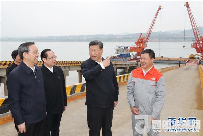 4月26日下午,中共中央總書記、國(guó)家主席、中央軍委主席習(xí)近平在武漢主持召開深入推動(dòng)長(zhǎng)江經(jīng)濟(jì)帶發(fā)展座談會(huì)并發(fā)表重要講話。這是座談會(huì)前,習(xí)近平于24日中午到興發(fā)集團(tuán)宜昌新材料產(chǎn)業(yè)園,察看化工企業(yè)搬遷、改造以及碼頭復(fù)綠情況。新華社記者 鞠鵬 攝