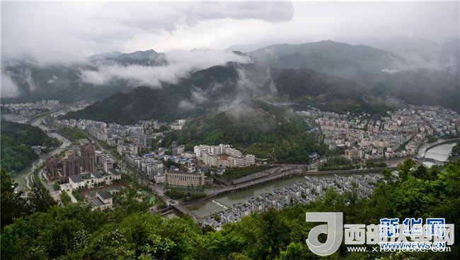 汶川地震后在原址上重建的新青川縣城(4月25日無(wú)人機(jī)拍攝)。新華社記者陶明攝