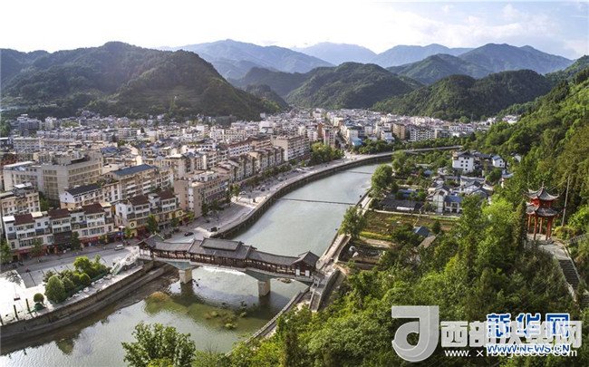 新青川縣城喬莊河上興建的感恩廊橋(4月25日無(wú)人機(jī)拍攝)。新華社記者陶明攝