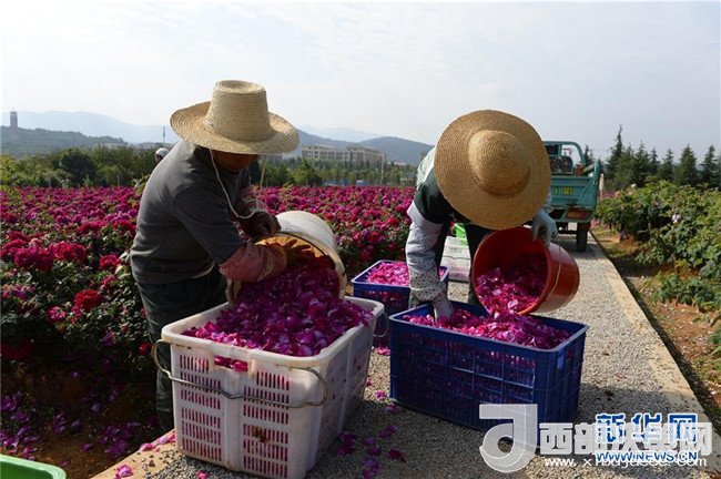 4月25日,兩名工作人員在云南大學(xué)呈貢校區(qū)的玫瑰園收集已采摘的玫瑰準(zhǔn)備送往學(xué)校食堂。