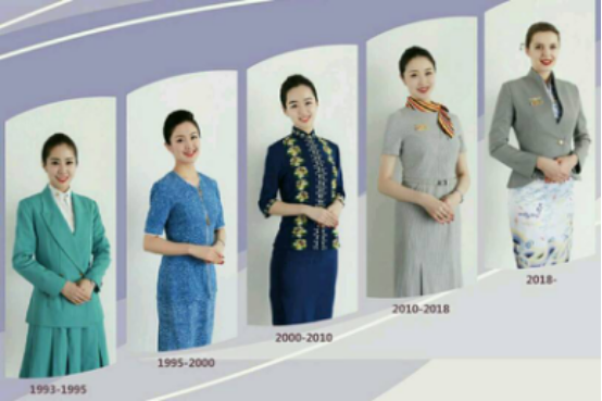 歲月變遷,以優(yōu)質(zhì)服務(wù)贏得客戶青睞的初心不改。圖為海航空乘人員的五代服裝,反應(yīng)了時(shí)代的變化。