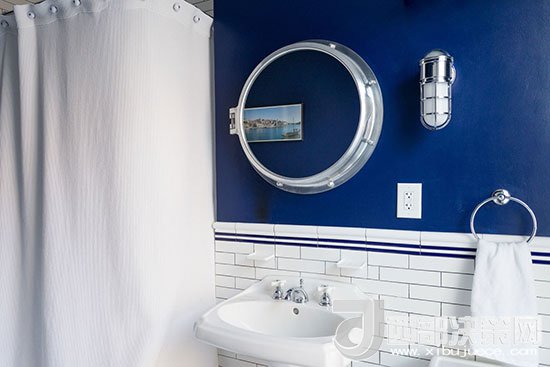 衛(wèi)浴間選擇深藍色與白色搭配,墻面中間位置用藍色條紋腰線來裝飾,頗有海軍風(fēng)的味道,干凈清爽。