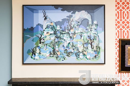 壁爐上方的墻面用掛畫來裝飾,藍色系的色彩與家居整體風(fēng)格相融合,富有創(chuàng)意感的畫面讓家更有藝術(shù)氣息。