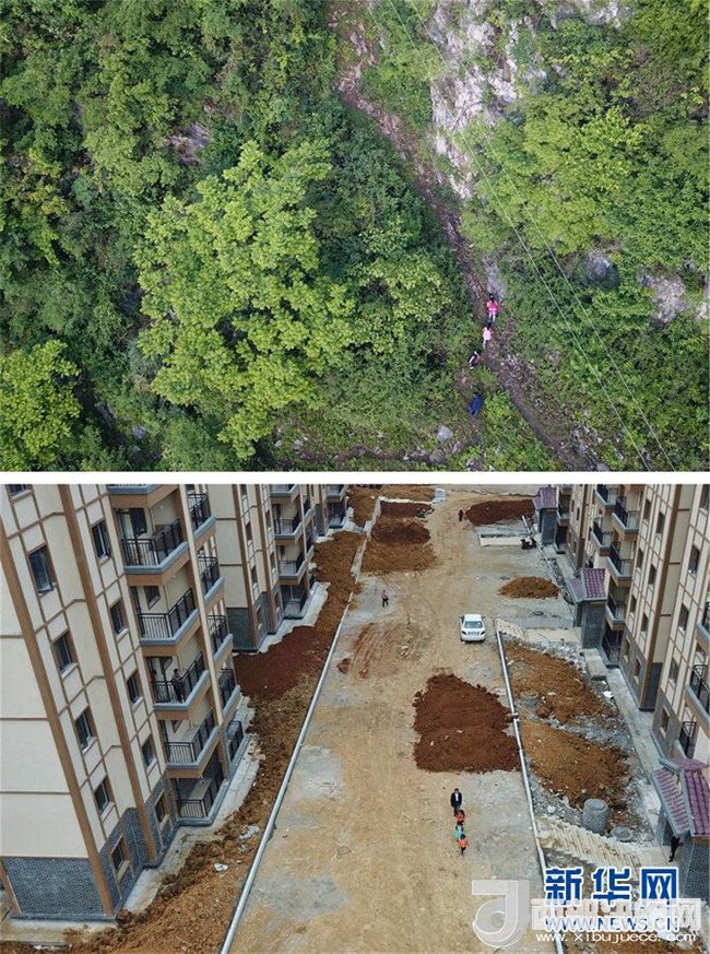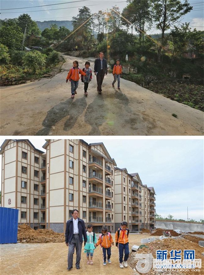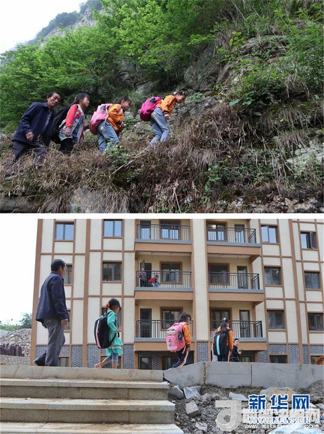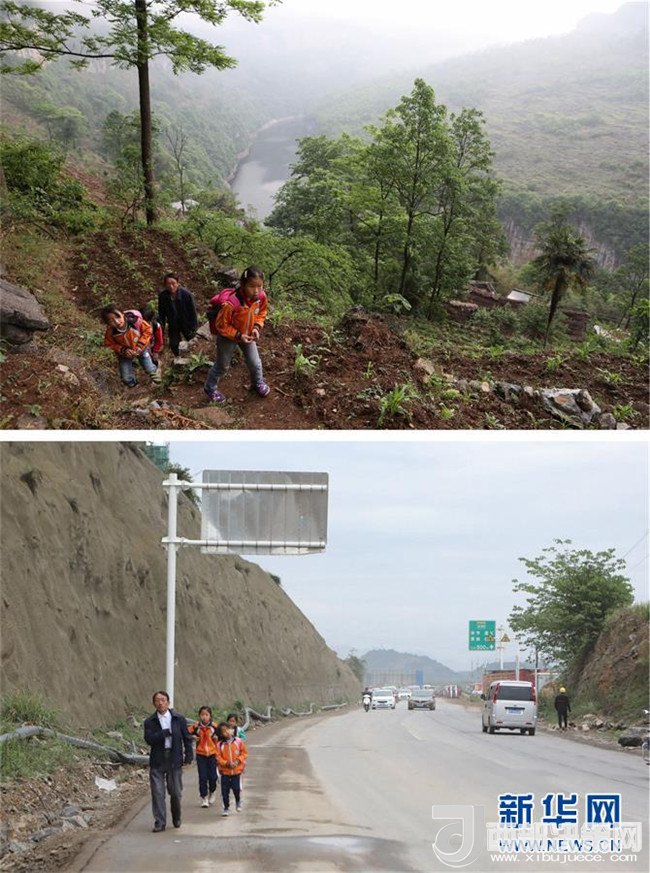 拼版照片:上圖為教師楊紹書和學(xué)生們在崖壁上的小路行走(4月27日攝);下圖為教師楊紹書和學(xué)生從新居內(nèi)走出前往新學(xué)校(5月7日攝)。
