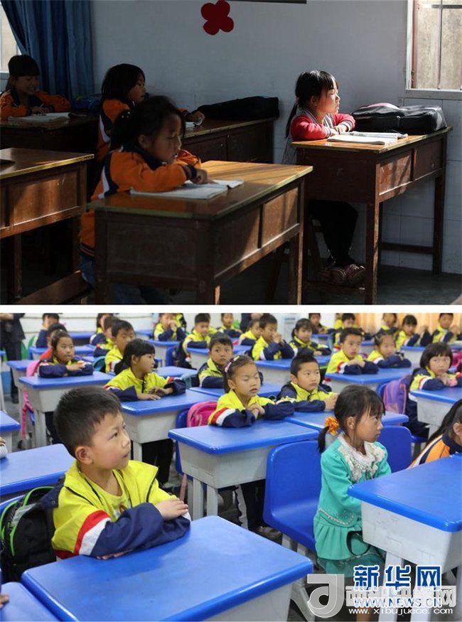 拼版照片:上圖為7歲的李曉彤(右一)在華山小學(xué)教室內(nèi)晨讀(4月27日攝);下圖為7歲的李曉彤(前排左二)在黔西縣第十小學(xué)教室內(nèi)上課(5月7日攝)。