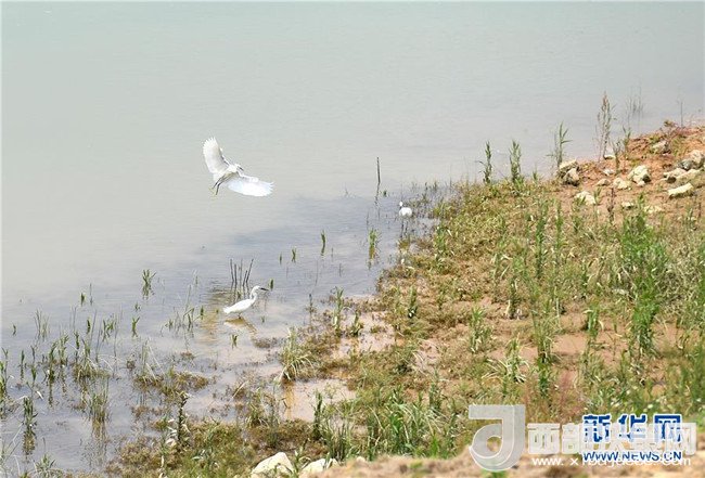3只白鷺在邕江美麗南方景區(qū)段整治后的灘涂邊覓食(5月18日攝)。