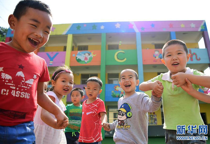 陜西省安康市漢濱區(qū)雙龍鎮(zhèn)杜壩村五四小學(xué)附設(shè)幼兒園小朋友們在操場上做游戲(2017年6月16日攝)。這個幼兒園使用貸款資金翻修改造而成,有效解決了該村及周邊兒童學(xué)前教育缺失的問題。新華社記者 邵瑞 攝