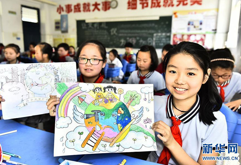 合肥市蜀山區(qū)井崗鎮(zhèn)新城小學(xué)學(xué)生展示自己在“善待地球,童繪藍天——我與地球的故事”繪畫活動中的作品(4月19日攝)。新華社發(fā)(葛宜年 攝)