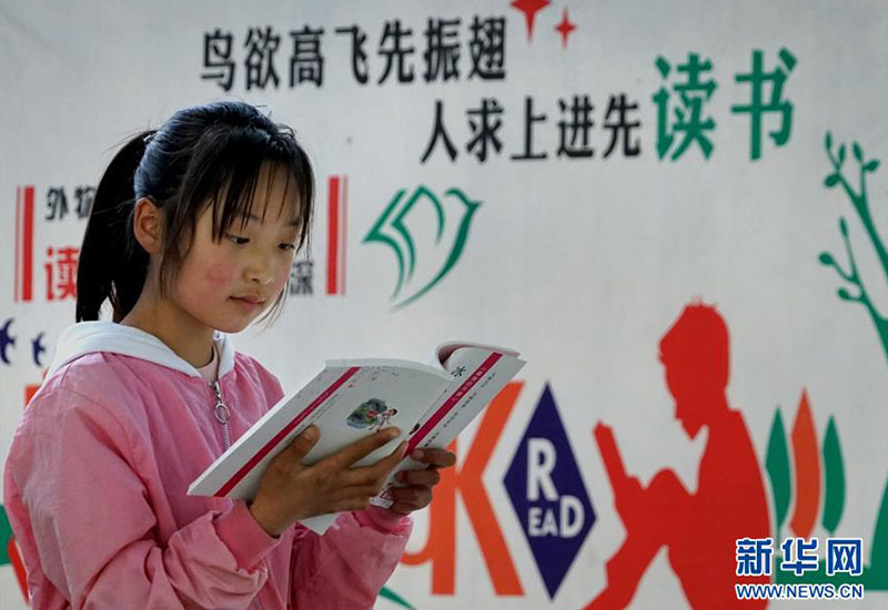 河南焦作市博愛縣寨豁鄉(xiāng)小學(xué)學(xué)生郭艷冰在校內(nèi)閱讀從“焦作市圖書館館外流通點”借閱的書籍(4月18日攝)。新華社記者 李安 攝