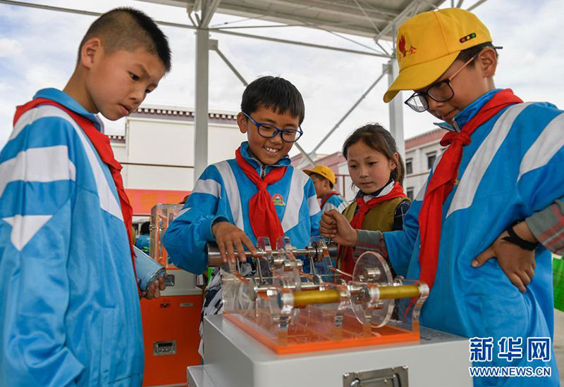 幾名學(xué)生在拉薩市流動科技館巡展活動現(xiàn)場體驗科學(xué)小實驗(5月24日攝)。 新華社記者 劉東君 攝