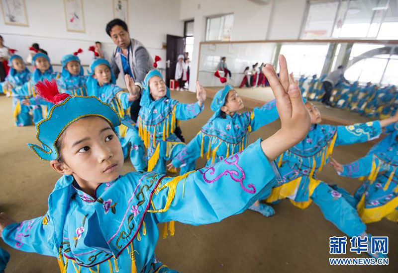 江蘇省南通市海安縣西場小學(xué)學(xué)生在練習(xí)京劇(5月26日攝)。新華社發(fā)(徐勁柏 攝)