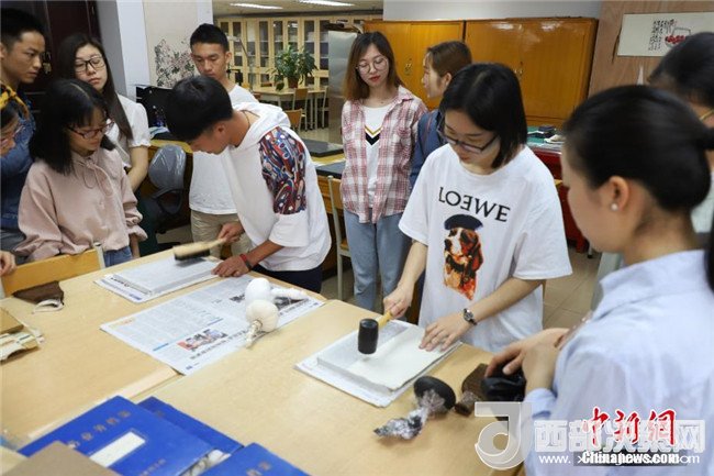 兩位同學在正在體驗碑文的傳拓技藝。中新社發(fā)瞿宏倫攝