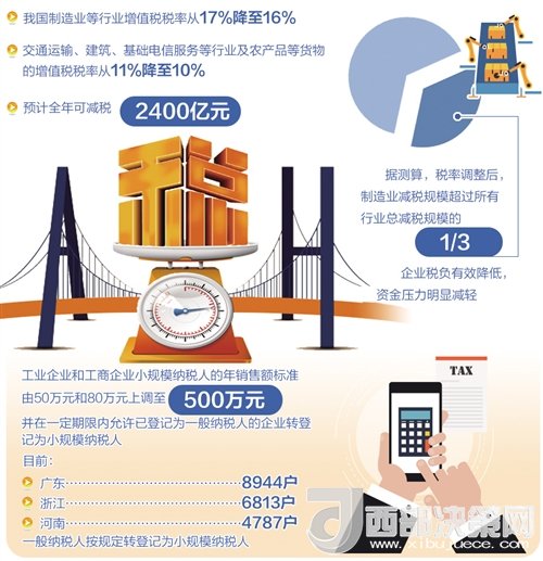 從5月1日起,我國制造業(yè)等行業(yè)增值稅稅率從17%降至16%,交通運輸、建筑、基礎電信服務等行業(yè)及農(nóng)產(chǎn)品等貨物的增值稅稅率從11%降至10%,預計全年可減稅2400億元。