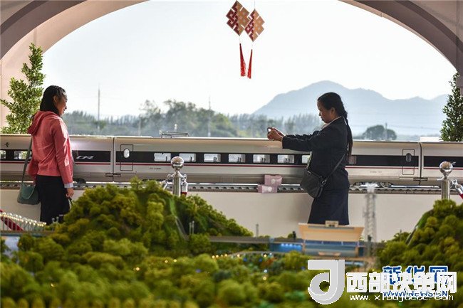 在泰國(guó)東北部呵叻府巴沖縣,參觀者在中泰鐵路合作項(xiàng)目一期工程開工儀式上與展出的中國(guó)復(fù)興號(hào)高鐵列車模型合影(2017年12月21日攝)。新華社記者 李芒茫 攝