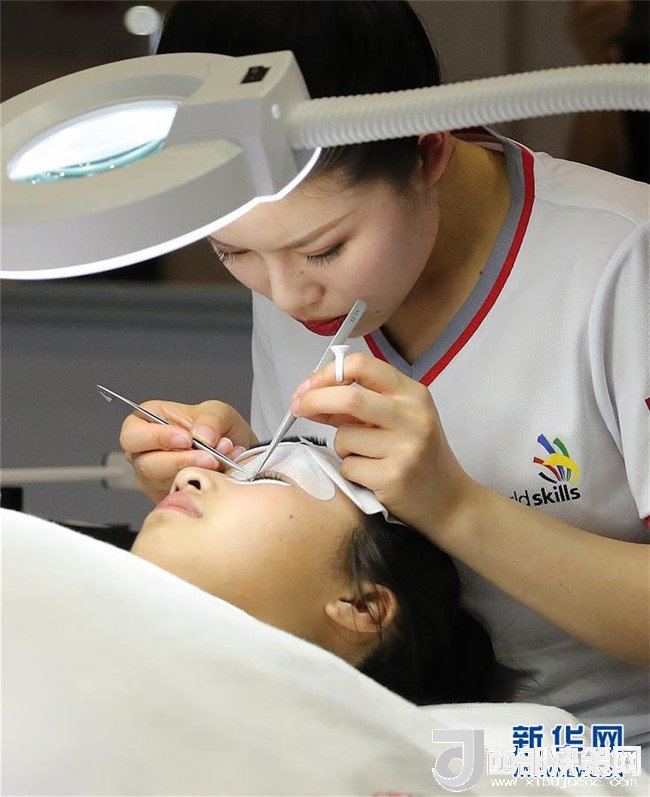 在第45屆世界技能大賽全國選拔賽上海賽區(qū)比賽中,一名美容項目參賽選手(上)在進行植睫毛操作(6月13日攝)。新華社記者 方喆 攝