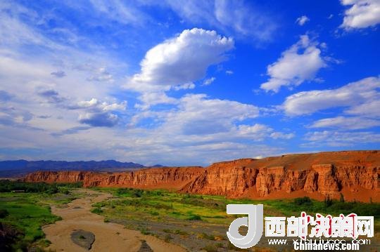 站在天山紅河谷入口處的斷崖邊,可以清晰地看到遠(yuǎn)處的天山,天然的紅土飄帶,一簇簇的綠蔭,坐落有致的農(nóng)家院落。荒涼的戈壁與斷崖下的美景,給人以強(qiáng)烈的視覺沖擊。紅色的山巖,猶如一條鑲嵌在天際間的飄帶而光彩奪目,河谷內(nèi)寧靜的村莊透露著幾分神秘。
