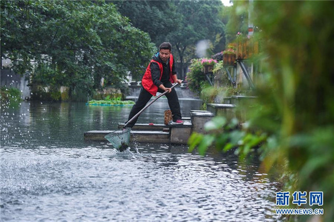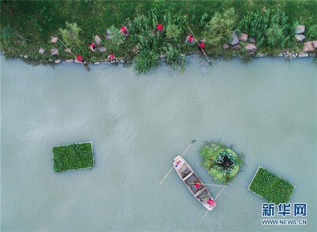 在浙江省長興縣劉家渡河道南太湖段,河長帶領(lǐng)專職保潔人員進行日常鄉(xiāng)村河道護理(2017年10月13日無人機拍攝)。