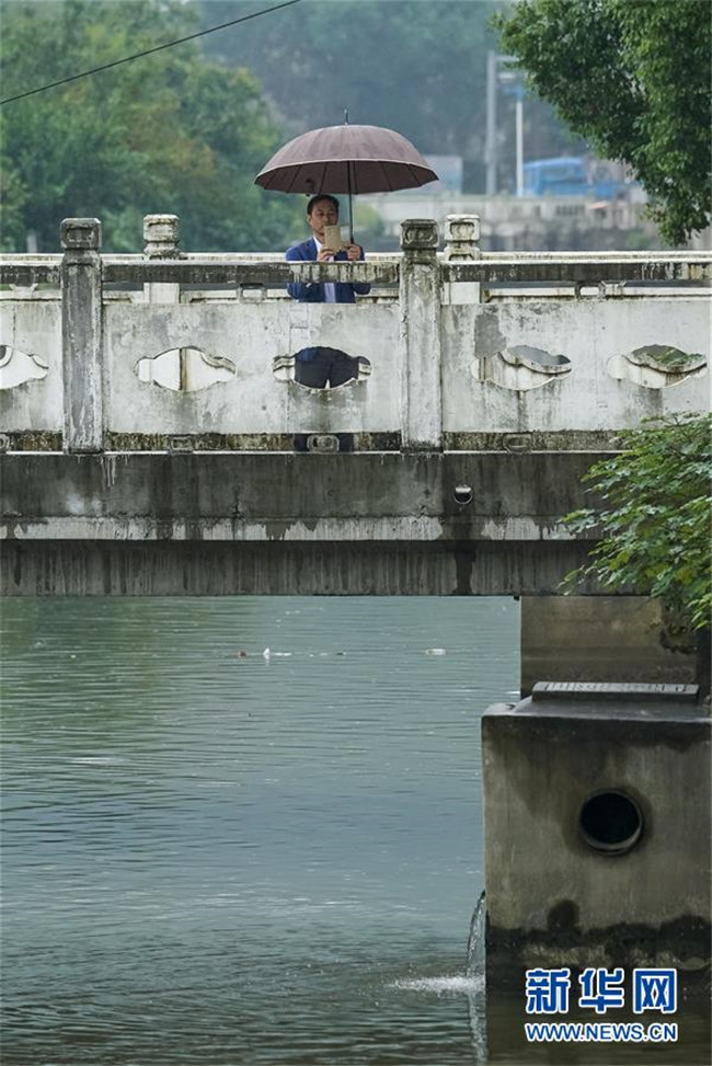 福建省福州市鼓臺中心區(qū)水系綜合治理點達道河河長溫水林在指揮工人進行河道新建截污管的回填(2017年10月11日攝)。