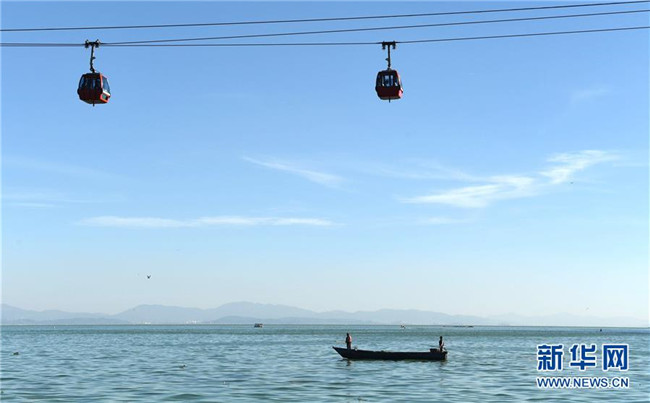 下方是工作人員在滇池上準(zhǔn)備打撈垃圾和雜物,上方是游客乘坐纜車在觀賞滇池景色(2017年11月14日攝)。云南省昆明市滇池流域自2008年以來實行河長制,河道生態(tài)環(huán)境和水質(zhì)得到明顯改善。