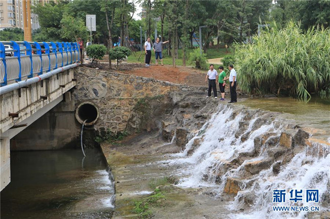 貴州省興義市桔山河的市級河長葛佳華(右二)與鎮(zhèn)級、村級河長對桔山河沿線一處排污管道進行巡查(2018年7月15日攝)。