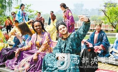 在大唐芙蓉園,身著唐朝服飾的外國游客。