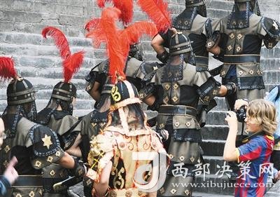 外國游客被威武的城墻武士所吸引。
