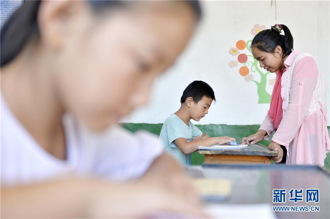 9月9日,崔芳英老師為學(xué)生郭衛(wèi)寧輔導(dǎo)功課。  新華社記者 朱旭東 攝