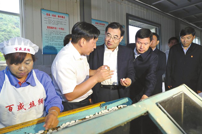 9月13日,省委書(shū)記胡和平深入商洛市鎮(zhèn)安縣調(diào)研脫貧攻堅(jiān)工作。圖為在百盛繅絲廠,胡和平了解選繭、繅絲等生產(chǎn)流程,聽(tīng)取公司生產(chǎn)經(jīng)營(yíng)和脫貧幫扶情況介紹。 記者 宋紅梅攝