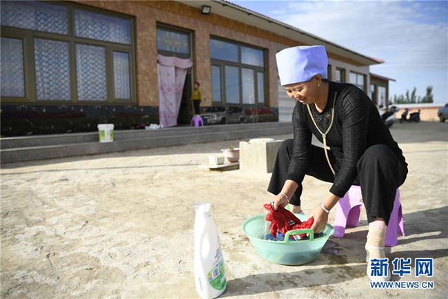 在中寧縣喊叫水鄉(xiāng)賀家口子村,村民金風花在洗衣服(9月6日攝)。新華社記者 王鵬 攝