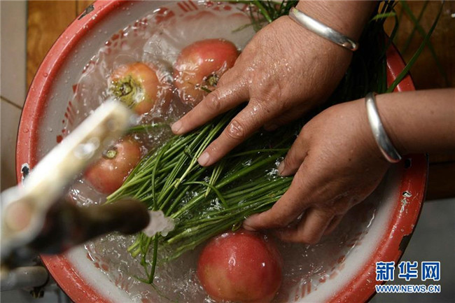 在中寧縣喊叫水鄉(xiāng)賀家口子村,村民金風花在洗菜(9月6日攝)。新華社記者 王鵬 攝
